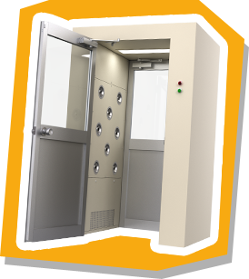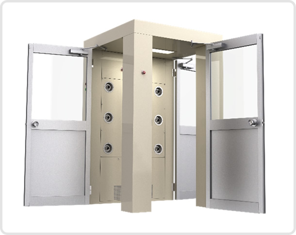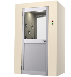 クリーンルーム内に外部から人や物が入るとき、それに付着した塵埃などの汚染物質を持ち込ませないようにする必要があります。そのためクリーンルーム室内(CR側)と外部(DR側)の間に扉によって仕切られた小部屋を設け、中に入ってきた人や物に清浄空気を吹き付けることで塵埃等を除去します。エアシャワーにはエアフィルタ及び送風機が組み込まれており、壁面や天井に取り付けられた吹出し口から風速約23m/s以上の清浄空気を吹き付ける構造です。
